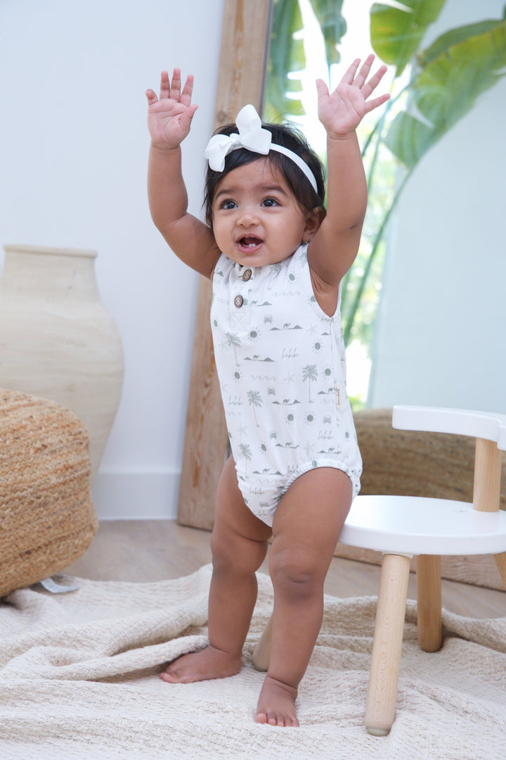 Embrace the warmth and charm of Dubai with our Habibi Romper. Designed with our signature Habibi print, this romper brings a touch of our favorite parts of Dubai to your little one’s wardrobe. Super soft and made for comfort, it features stretchy legs to allow plenty of room for movement, and poppers at the bottom for easy diaper changes. The button access at the top makes dressing a breeze, while the lightweight fabric is perfect for warmer weather.